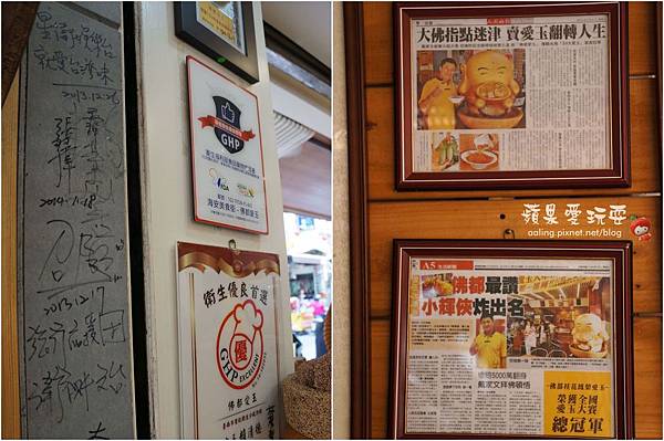 牆上有名人簽名和平面媒體報導。
